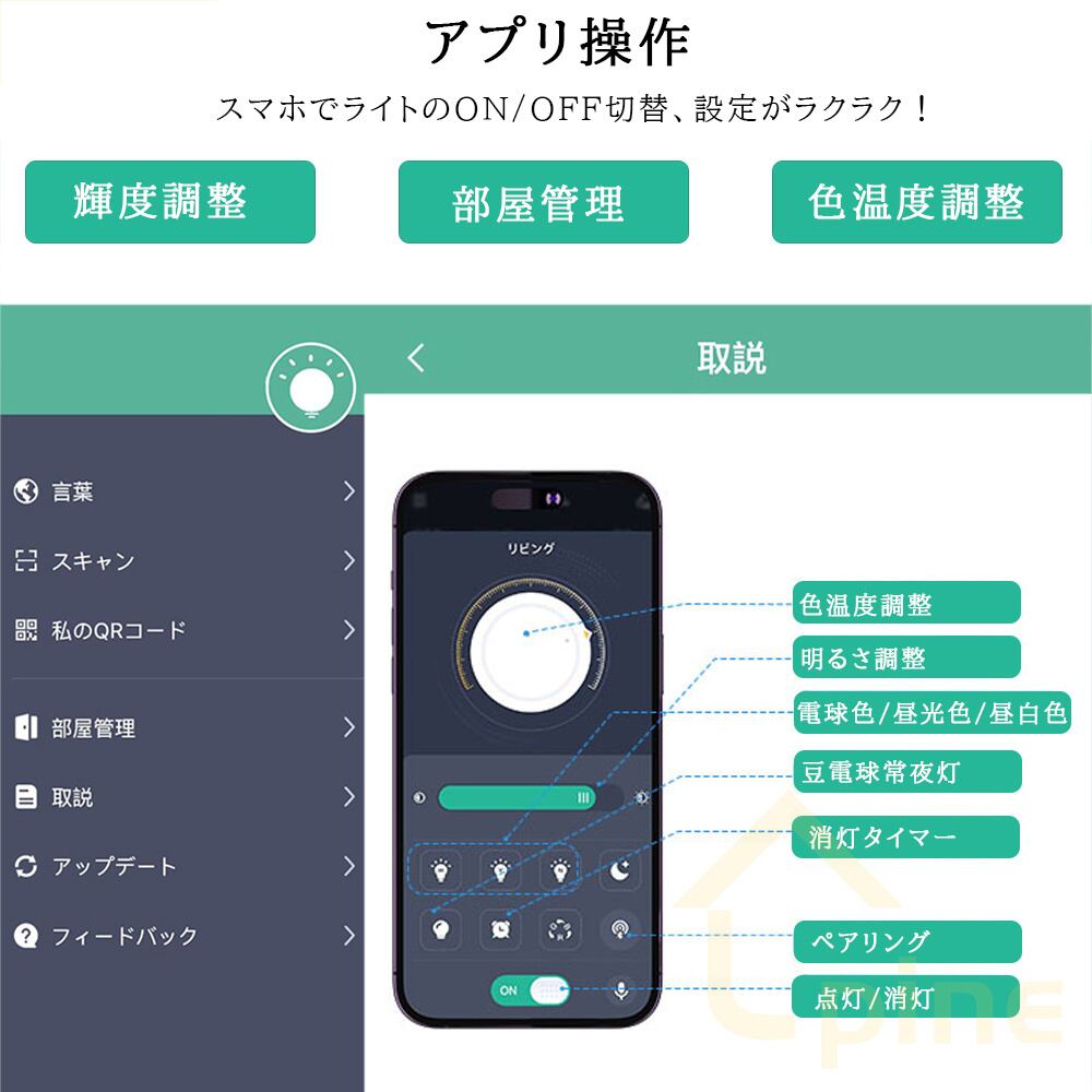 調光調色:アプリ・リモコン制御で遠距離にシーリングライトのon/off、色温度、明るさを簡単に設定できます。リモコンの輝度と色温度ボタンを長押して無段階調色・調光できます。<br>